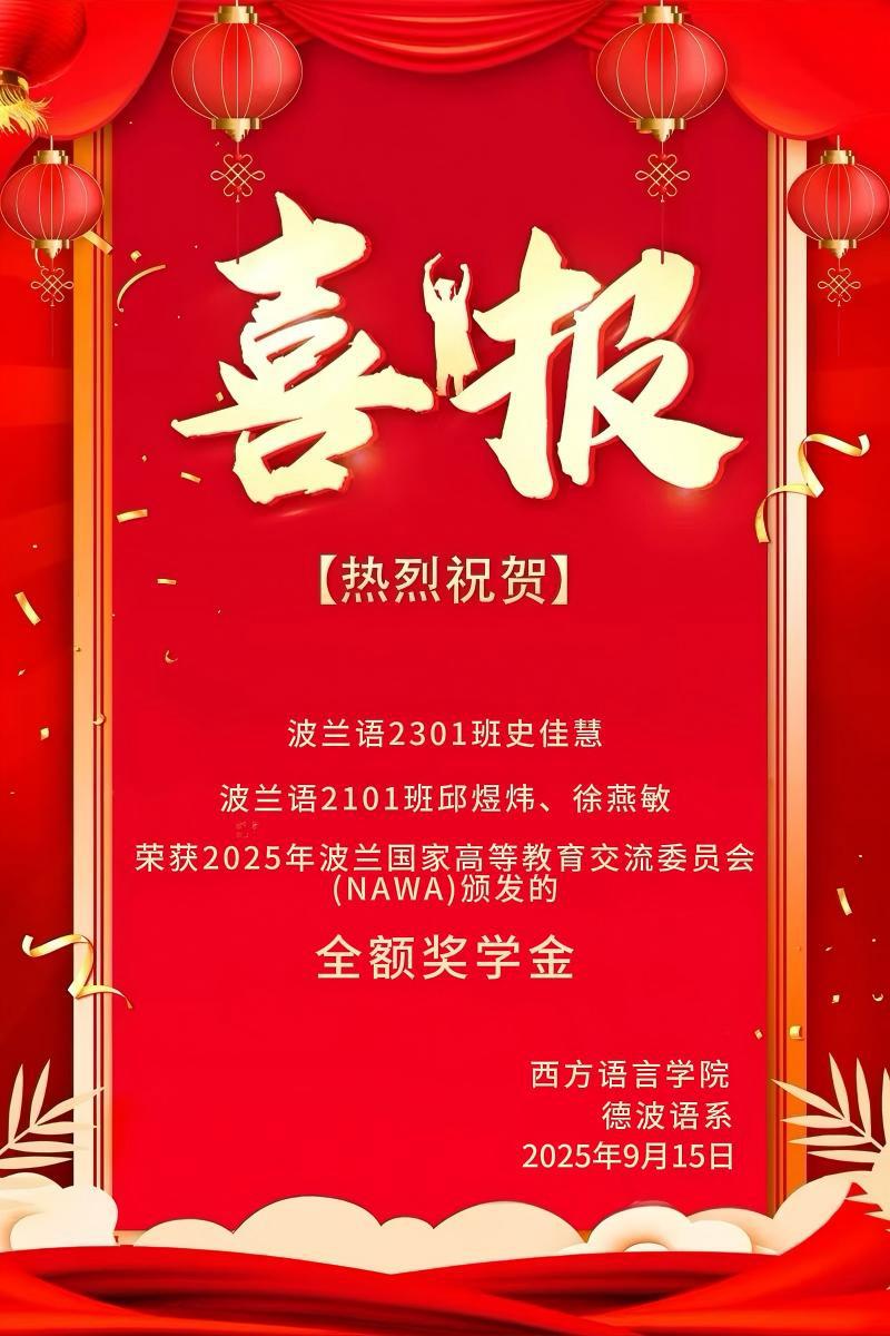近日,波兰国家学术交流委员会(NAWA)官方网站正式公布了2025年奖学金获奖名单。本年度仅有52人入选,我院波兰语专业2023级史佳慧、2021级邱煜炜和徐燕敏三位同学脱颖而出,成功获得该项全额奖学金。