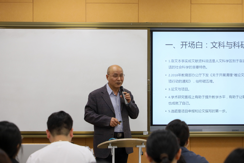 凌建侯教授开宗明义,以“文科与科研”的关系为切入点,深刻阐述了人文社会科学研究的独特价值与时代使命,并在此基础上强调了选题对于项目申报和论文撰写的重要性。