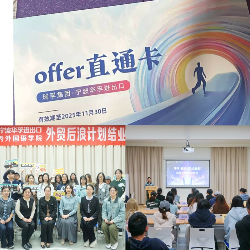 为深化校企合作、助力高质量就业与人才培养,西方语言学院于2025年11月5日,携手瑞孚集团华孚进出口有限公司在D146举办“华孚外贸后浪计划”结业仪式。党委副书记方江英、企业人力总监周雪娜、全体参训学员,以及不少自愿到场的宁波籍非毕业班学生共同参与了本次活动。