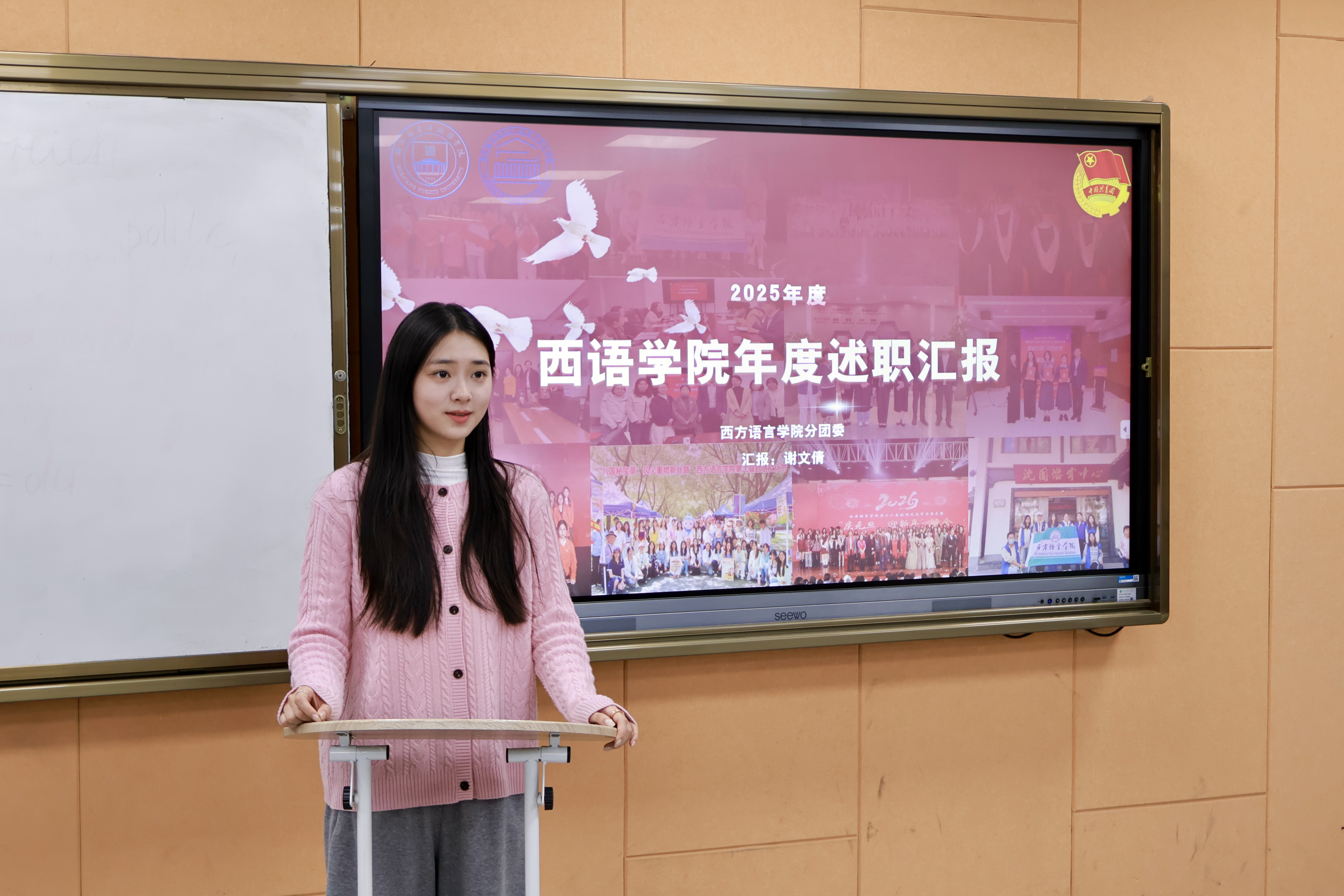2025年12月23日晚,西方语言学院团委学生会述职大会在D429顺利举行。团学指导老师张磊、学院团委学生会全体干部代表参会,会议由执行主席谢文倩主持。