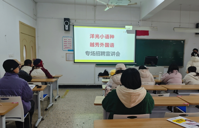 为搭建小语种专业学生就业实习对接平台,助力学生明晰职业发展方向,1月5日下午,洋光小语种举办的专场招聘会在D228教室顺利开展。本次招聘会由法语系副主任陈洁琼主持,洋光小语种企业代表任可歆及学生参与活动。