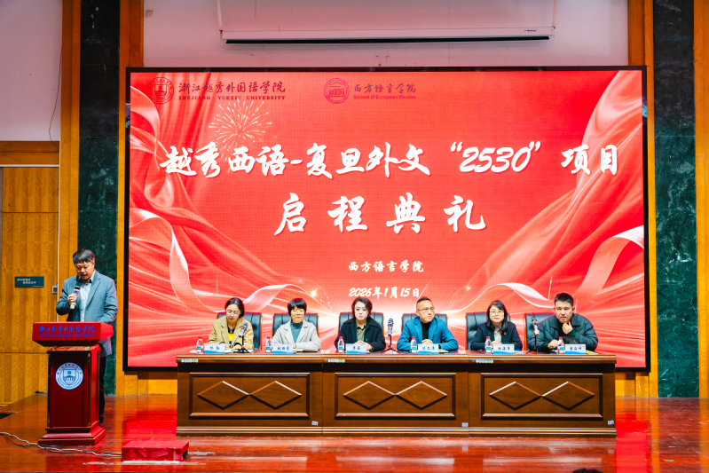 2026年1月15日上午,越秀西语-复旦外文“2530”项目入选学生启程典礼在稽山校区图书馆报告厅举行。浙江越秀外国语学院副校长陈文涛教授、教务处魏丽青副处长、学生处杨勤副处长、保卫处潘海峰副处长、西方语言学院班子成员、全体班主任及入选学生参加活动。典礼由西方语言学院院长助理赵吉鹏博士主持。