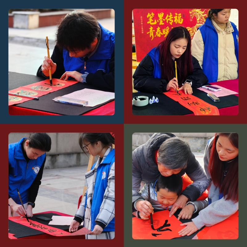 活动现场洋溢着喜庆祥和的节日氛围。在学院党委的精心组织和带领下,师生党员志愿者们提前布置场地、准备物资,并主动为社区居民提供书写指导与协助。活动中,党员志愿者与社区居民一起挥毫泼墨,书写“福”字与春联,将党的温暖与新春祝福融入笔墨之间。