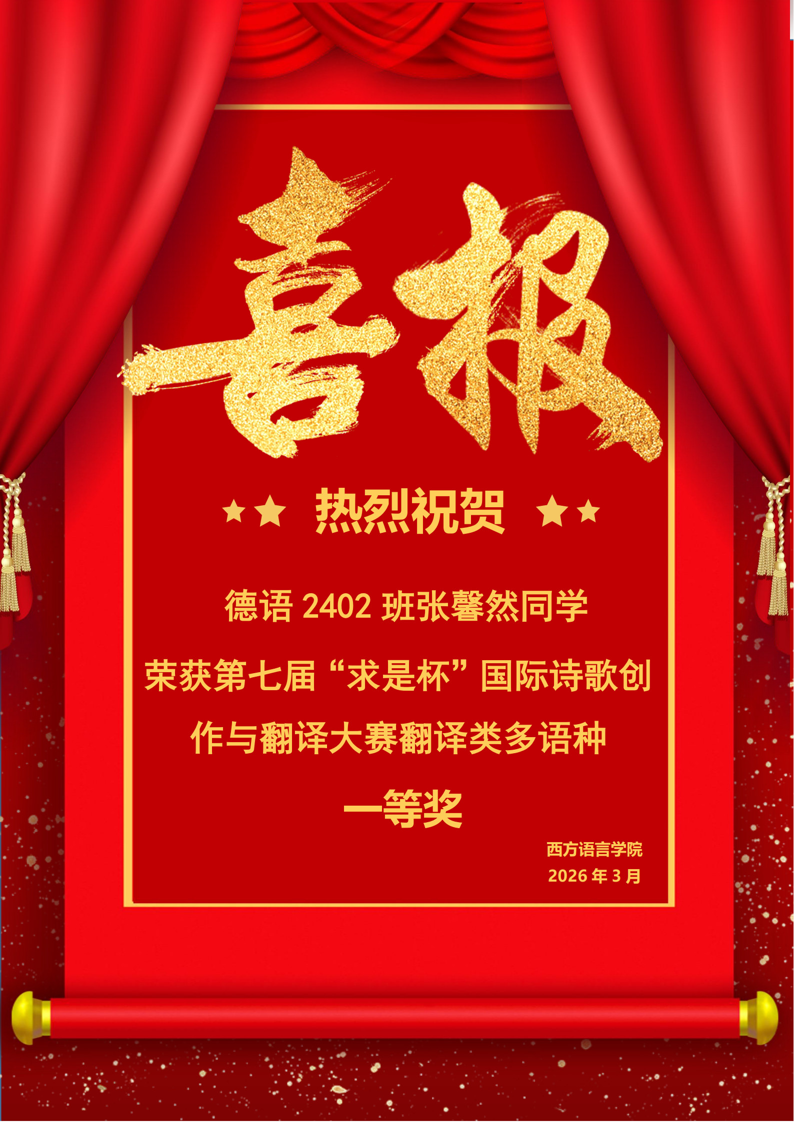 喜报|德语 2402 班张馨然同学荣获第七届“求是杯”国际诗歌创作与翻译大赛翻译类多语种一等奖