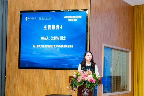 第四场报告由浙江越秀外国语学院西方语言学院俄语系副主任沈彬彬博士主持。北京外国语大学于鑫教授以俄语翻译硕士培养为例,探讨了人工智能赋能研究生教学改革的具体路径,强调应构建“翻译+专业+技术”的融通型培养模式。北京外国语大学孙芳教授以北外为案例,分享了人工智能和大数据对中国高等教育在智慧课堂、数字教材、AI智能评测及学科发展、高校治理等方面的深远影响,并提出了当前面临的数据伦理、技术至上倾向及教师转型压力等主要挑战。