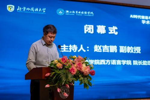 当日下午,研讨会顺利闭幕。浙江越秀外国语学院西方语言学院院长助理赵吉鹏副教授主持闭幕式。北京外国语大学俄语学院副院长、《欧亚人文研究》副主编孙芳教授与浙江越秀外国语学院西方语言学院俄语系主任苏维副教授先后致辞,高度评价本次会议在推动俄语学科与欧亚人文研究守正创新、智能转型方面的积极贡献,并期待以此次研讨会为契机,进一步深化校际合作与学术交流。