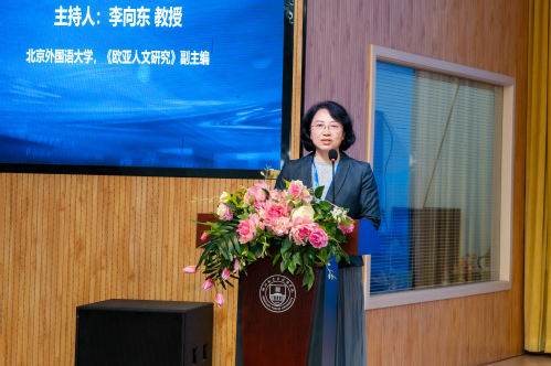 第三场报告由北京外国语大学李向东教授主持。浙江外国语学院王松亭教授系统阐述了AI时代外语教育的困境与出路,提出培养目标、课程体系与发展路径的三大转向,为AI时代外语专业的转型升级指明了方向。西安外国语大学黄达远教授从俄乌冲突带来的地缘安全风险切入,分享了“环里海区域研究”智库建设的实践经验,回应了欧亚大陆变局下的地缘安全与区域研究新挑战。北京外国语大学蔡晖教授回顾了《欧亚人文研究》创刊六年的发展历程,进一步明确了期刊聚焦“大欧亚”视野的学术定位,并分享了对人工智能时代俄语专业发展及刊物未来走向的思考。